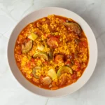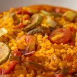 Arroz , calabacín , zanahoria, puerro , tomate , setas , alcachofas , berenjena , ajo , cebolla , cúrcuma , pimentón , comino , aceite de oliva )
