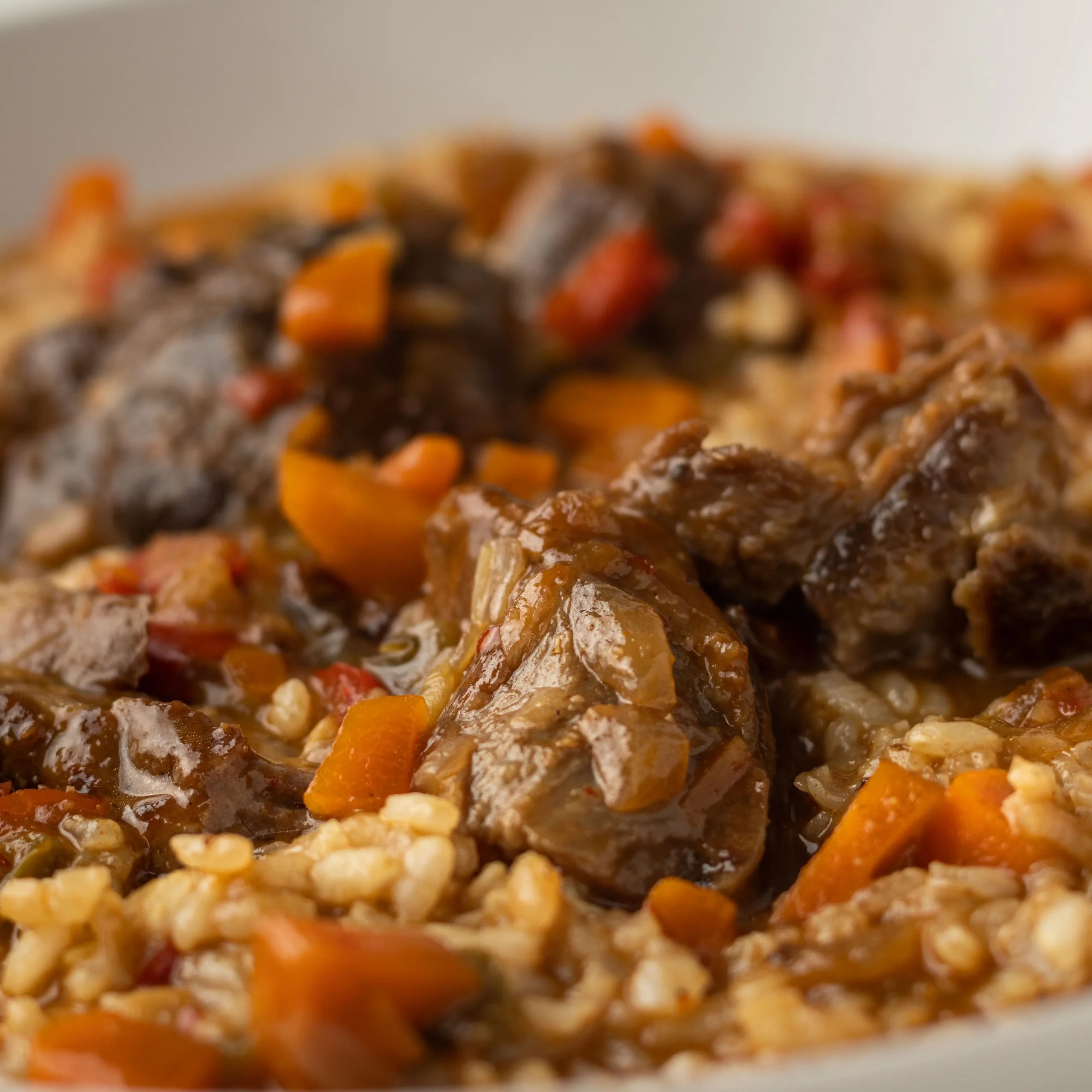 Arroz , carrillada, cebolla , zanahoria , ajo , tomate , pimiento verde, pimiento rojo , pimentón , vino tinto , comino , aceite de oliva