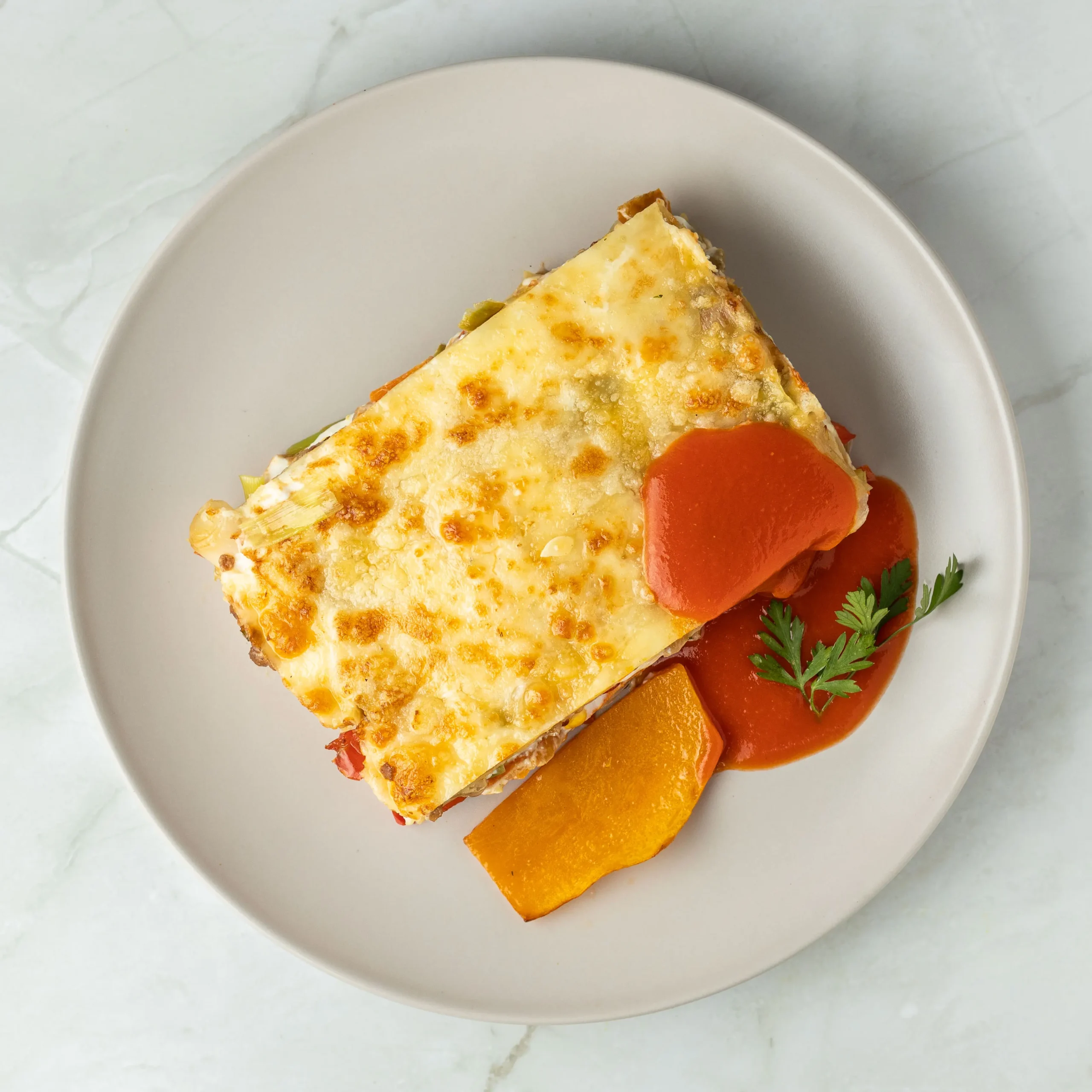 Pasta, queso vegano, tomate, nuez moscada, calabacín, berenjena, cebolla, pimiento rojo, pimiento verde, setas, calabaza, puerro, sal aceite de oliva