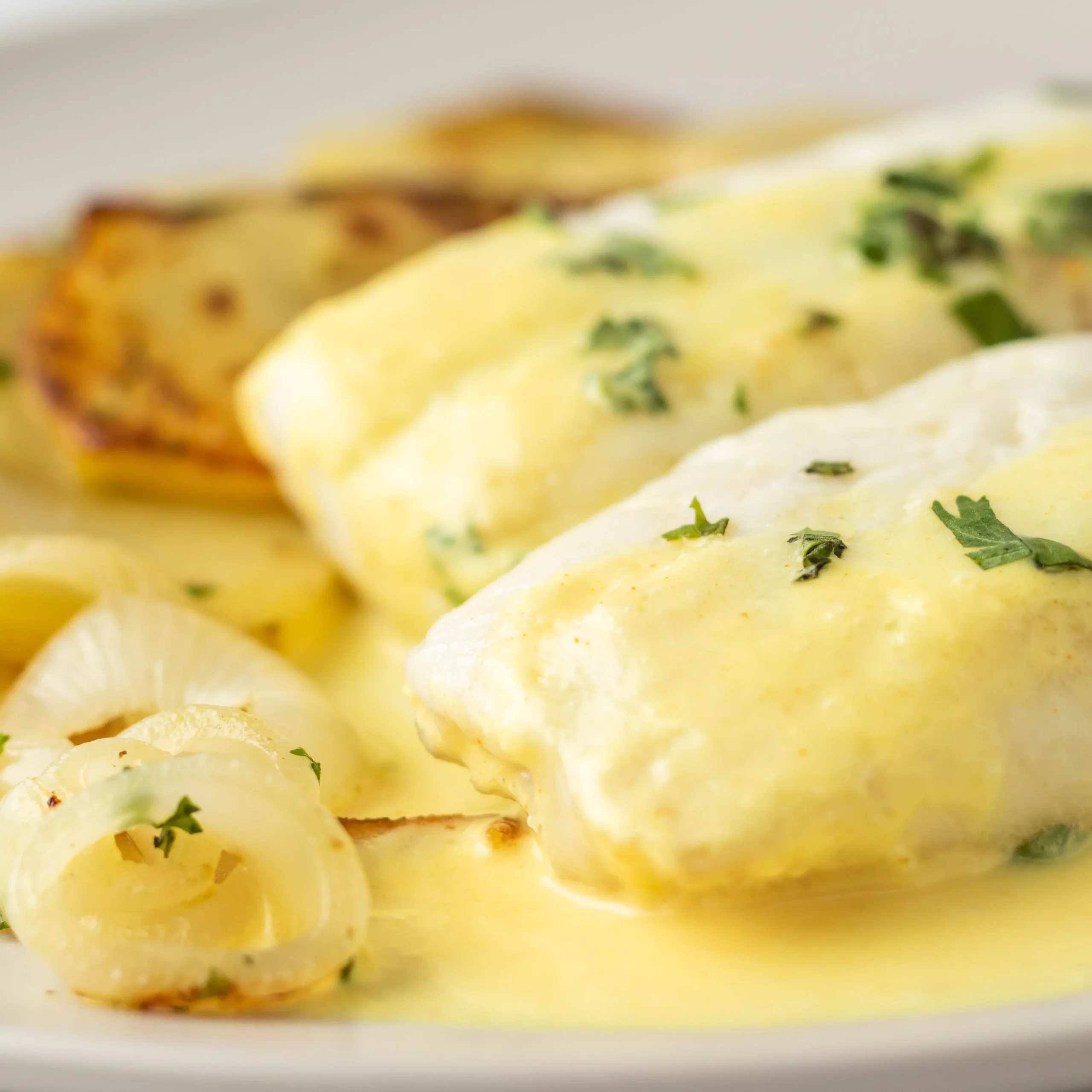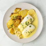 Merluza al limón con patatas panaderas y cebolla