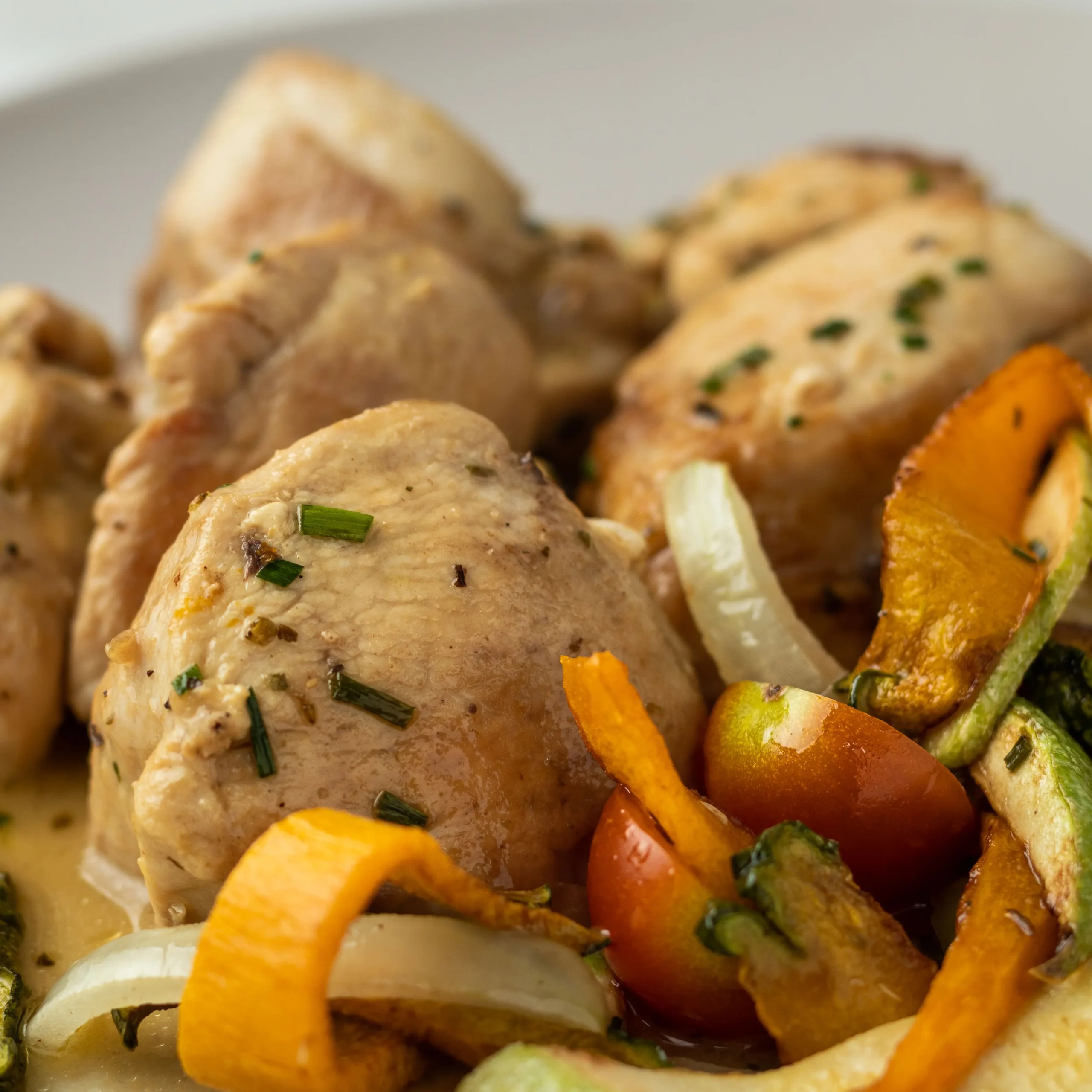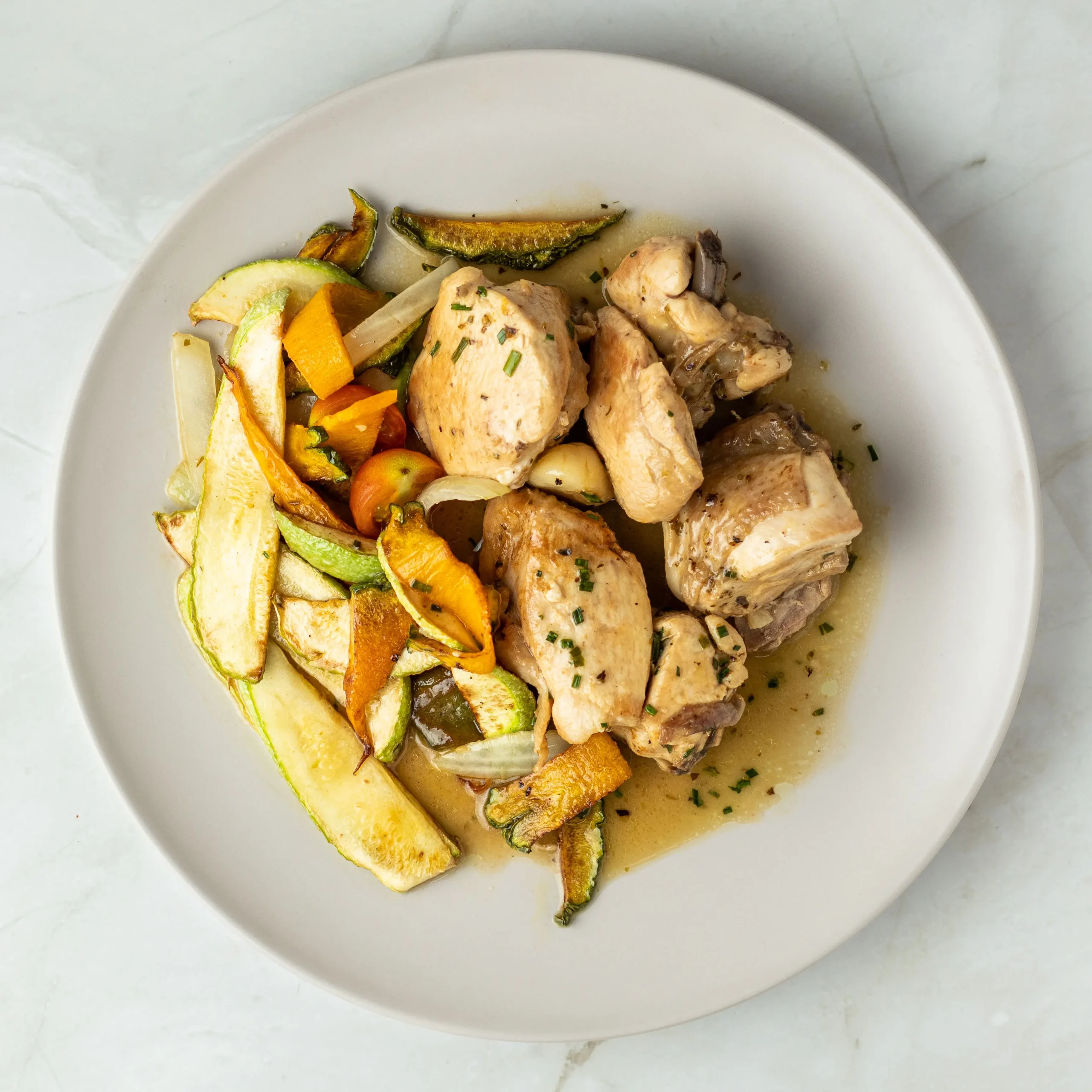 Pollo, ajo, brandi, verduras, pimienta, vino blanco, sal, aceite de oliva.